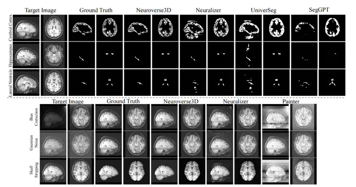 In-context learning (ICL), a type of universal model, demonstrates exceptional generalization across a wide range of tasks without retraining by leveraging task-specific guidance from context, making it particularly effective for the intricate demands of neuroimaging. However, current ICL models, limited to 2D inputs and thus exhibiting suboptimal performance, struggle to extend to 3D inputs due to the high memory demands of ICL. In this regard, we introduce Neuroverse3D, an ICL model capable of performing multiple neuroimaging tasks in 3D (e.g., segmentation, denoising, inpainting). Neuroverse3D overcomes the large memory consumption associated with 3D inputs through adaptive parallel-sequential context processing and a U-shaped fusion strategy, allowing it to handle an unlimited number of context images. Additionally, we propose an optimized loss function to balance multi-task training and enhance focus on anatomical boundaries. Our study incorporates 43,674 3D multi-modal scans from 19 neuroimaging datasets and evaluates Neuroverse3D on 14 diverse tasks using held-out test sets. The results demonstrate that Neuroverse3D significantly outperforms existing ICL models and closely matches task-specific models, enabling flexible adaptation to medical center variations without retraining.