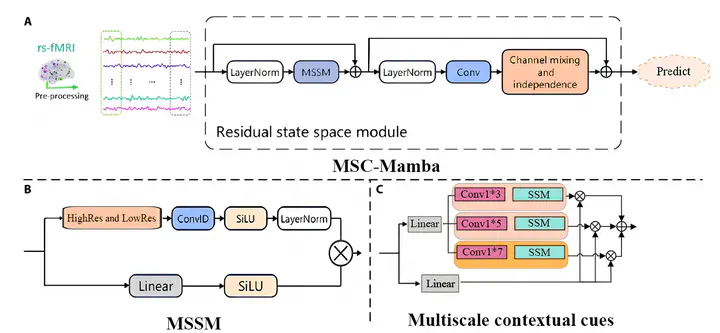 Major depressive disorder (MDD) and autism spectrum disorder (ASD) are complex and heterogeneous neuropsychiatric disorders with overlapping symptoms, presenting remarkable challenges for accurate diagnosis. Leveraging functional neuroimaging data offers an opportunity to develop more robust, data-driven approach for psychiatric disorder detection. However, existing methods often struggle to capture the long-term dependencies and dynamic patterns inherent in such data, particularly across diverse imaging sites. We propose Multiscale Contextual Mamba (MSC-Mamba), a Mamba-based model designed for capturing long-term dependencies in multivariate time-series data while maintaining linear scalability, allowing us to account for long-range interactions and subtle dynamic patterns within the brain’s functional networks. One of the main advantages of MSC-Mamba is its ability to leverage the distinct characteristics of time-series data, allowing it to generate meaningful contextual information across various scales. This method effectively addresses both channel-mixing and channel-independence scenarios, facilitating the selection of relevant features for prediction by considering both global and local contexts at multiple scales. Two large-scale multisite functional magnetic resonance imaging datasets, including REST-meta-MDD (n = 1,642) and Autism Brain Imaging Data Exchange (ABIDE) (n = 1,022), were used to validate the performance of our proposed approach. MSC-Mamba has achieved state-of-the-art performance, with an accuracy of 69.91% for MDD detection and 73.08% for ASD detection. The results demonstrate the model’s robust generalization across imaging sites and its sensitivity to intricate brain network dynamics. This paper demonstrates the potential of state-space models in advancing psychiatric neuroimaging research. The findings suggest that such models can significantly enhance detection accuracy for MDD and ASD, pointing toward more reliable, data-driven diagnostic tools in psychiatric disorder detection.